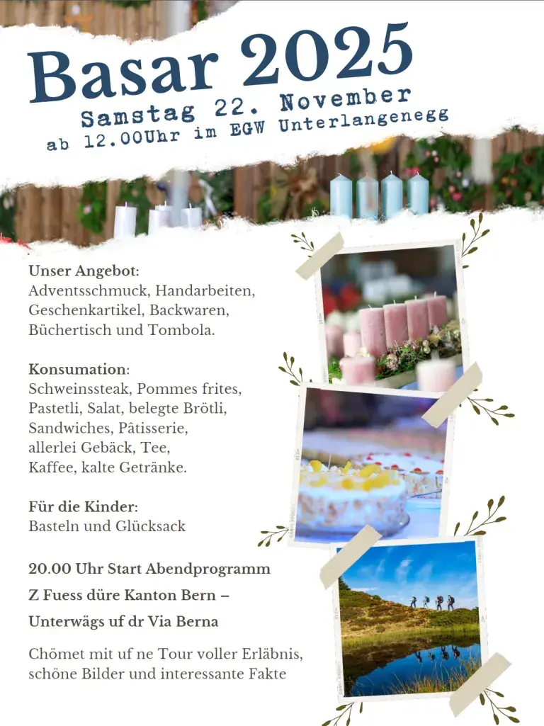 Jährlich findet am vierten Samstag im November der Basar statt. Es gibt ein grosses Angebot an Adventsdekorationen wie Kränze, Wand- und Türschmuck. Viele verschiedene Handarbeiten, Dekoartikel aus Holz und Bücher werden angeboten. Die Tombola wie auch das Basteln für die Kinder ist ein fester Bestandteil des Basars.