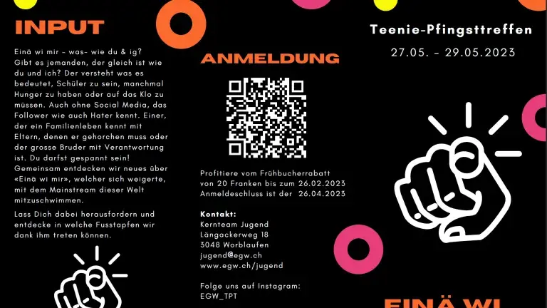 Unsere Treffen finden jede zweite Woche am Freitagabend oder Samstagnachmittag statt. Gemeinsam stellen wir uns den Fragen und Themen, die Teenager beschäftigen. Zusammen etwas zu erleben ist uns wichtig, deshalb kommen auch Ausflüge, Sport, Abenteuer, Essen und Trinken etc. nicht zu kurz.